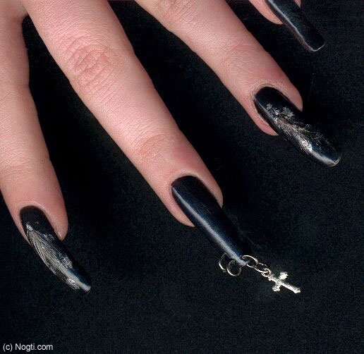 я раньше делала сама - красила ноготь в белый цвет, капала черный лак (сразу же)ближе к основанию ногтя и зубочисткой выводила что-то похожее на вот это (см. картинку)