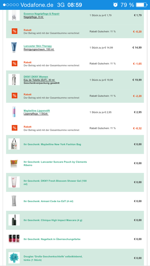 затарилась на 35,35€. Maybelline сумку в прошлом заказе уже получала, спереди х/б, сзади дермантин и ручки тоже. И большая, больше чем DM-овские х/б сумки. Clinique помаду тоже успела заполучить.