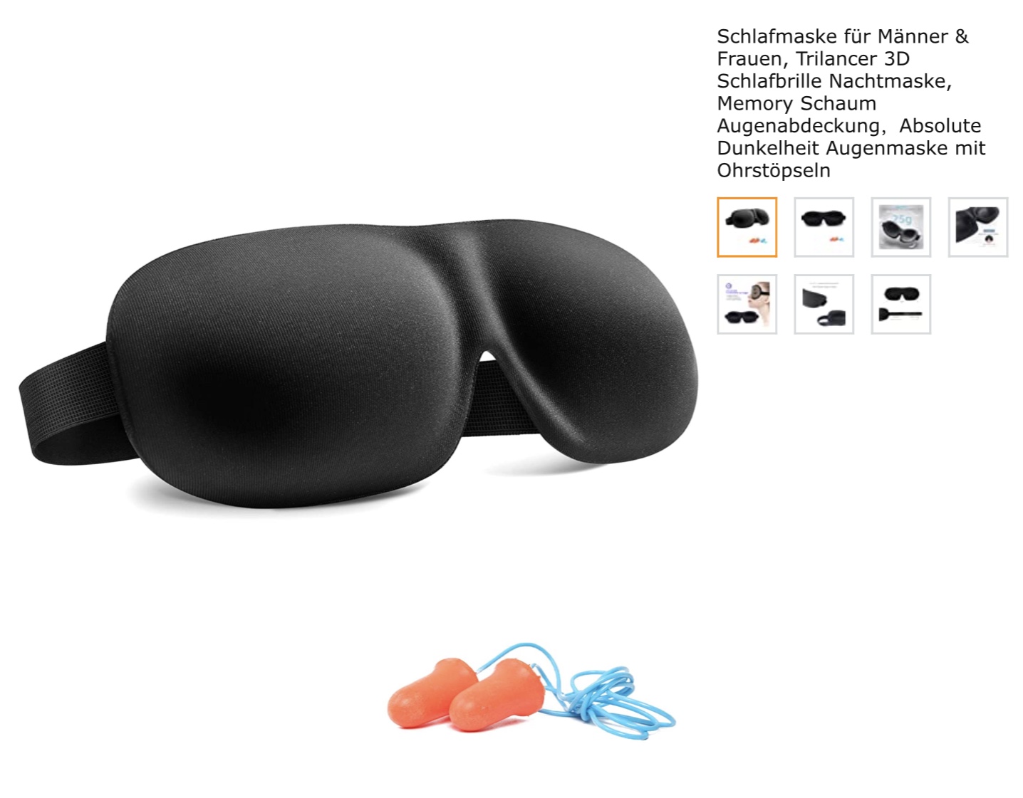 Я уже давно при необходимости сплю в маске, несколько лет, перепробовала разные, уже пару лет пользуюсь Trilancer 3D, не давит на глаза, хорошо прилегает, нет липучки, не цепляет волосы, резинка легкая и легко регулируется. Муж тоже такую же использует, если мне хочется почитать перед сном; заказываю здесь: https://www.amazon.de/dp/B07ZNHRLG5/ref=pe_27091401_487024491_TE_item_image