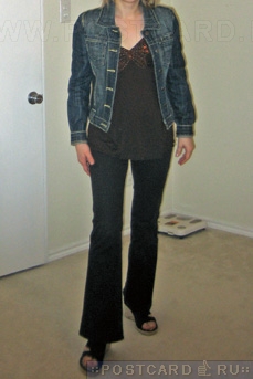 Девушка в джинсовой куртке - ничего особенного. Обувь только не подходит к одежде, а и не надо туда колготы надевать (они кажется у нее есть)...