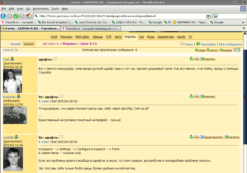 Так, начнем сначала. Итак я поставил сегодня на одну машину абсолютно чистую систему - поставил x-window-system, поставил wm, поставил firefox. Захожу на русский сайт - не отображает ВООБЩЕ ни одной буквы, то есть не понимает в упор кириллицы :). С чего начнем? С установки TTF? Их как прям из виндовса скопировать можно или есть пакет для линукса?