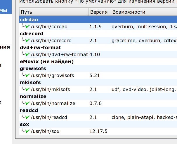 На всякий случай прикрепляю список внешних программ, которые k3b у меня нашел. Может быть у тебя чего-нибудь не установлено.