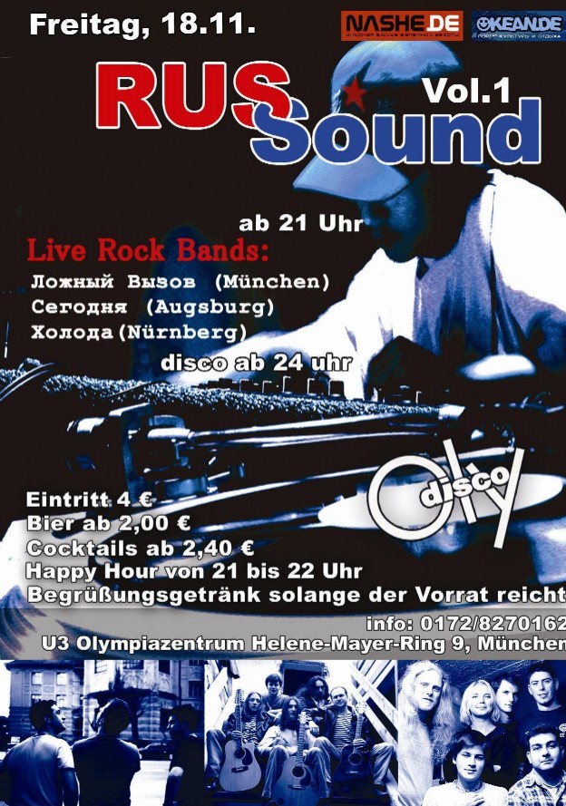 В Пятницу 18 Ноября начало в 21:00 состоится живой концерт при участии талантливых РОК-Групп из Мюнхена, Аугсбурга и Нюрнберга! После клубного выступления дискотека до утра!