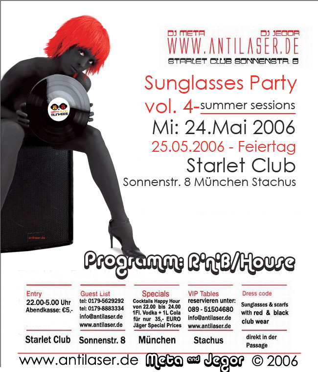 Посетить последнюю русскую R▓n▓B & House вечернку из серии Sunglasses Party Vol.4 - 24 Мая - в эту Среду (Четверг (25.05) выходной!) в клубе Старлет по адрессу Sonnenstr.8 √ Мюнхен Stachus! Start: 22.00.