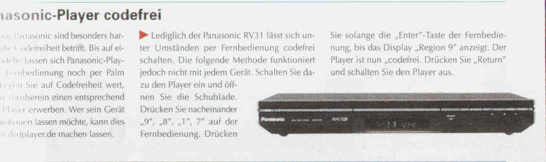 , информация оказалась неточной. В этом журнале (PC go 10.2003 стр 86-88) действительно была информация про изменение кода различных DVD-плейеров, но, к сожалению, Panasonik описан только RV31. На всякий случай прицепляю картинку, попробуй, может все-таки получится