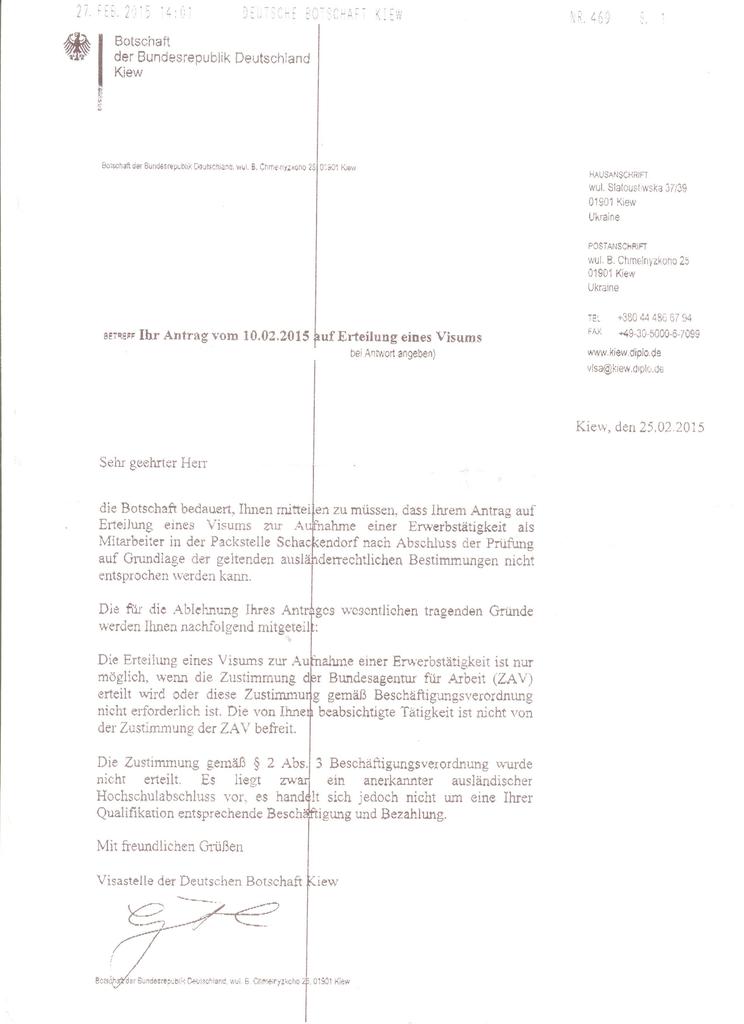 Отказное письмо оформлено, как будьто вас берут упаковщиком. неквалифицированные работники в германию не въезжают по рабочим визам. вы знаете, какой нижний порог зарплаты для рабочей эмиграции? вам в три раза больше надо зарабатывать.