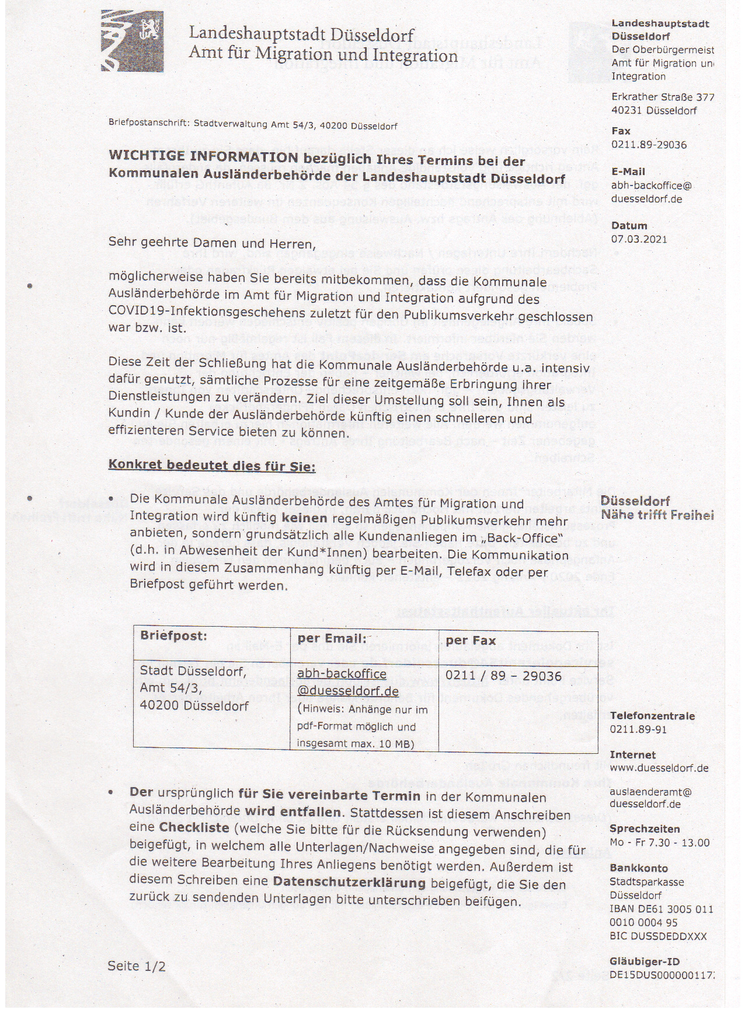 Aufgrund der derzeit gültigen Corona-Schutzverordnung sind aktuell keine persönlichen Vorsprachen vom 16.12.2020 bis einschließlich 28.03.2021 möglich.