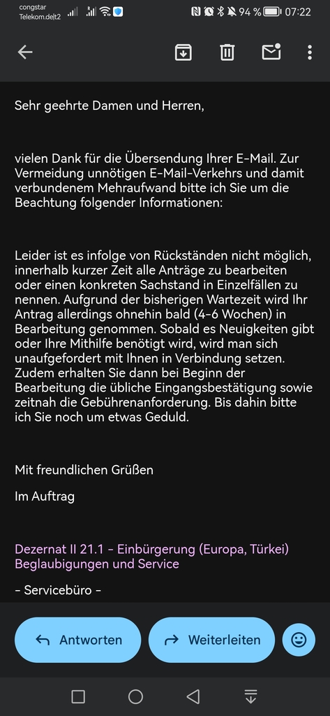 Когда прошло 14 месяцев, написала на общую почту, как там дела с моим антрагом. Ответили, что обработка начнется примерно через 3-4 недели. Не обманули и примерно через это время получила письмо, что они добрались до моих документов