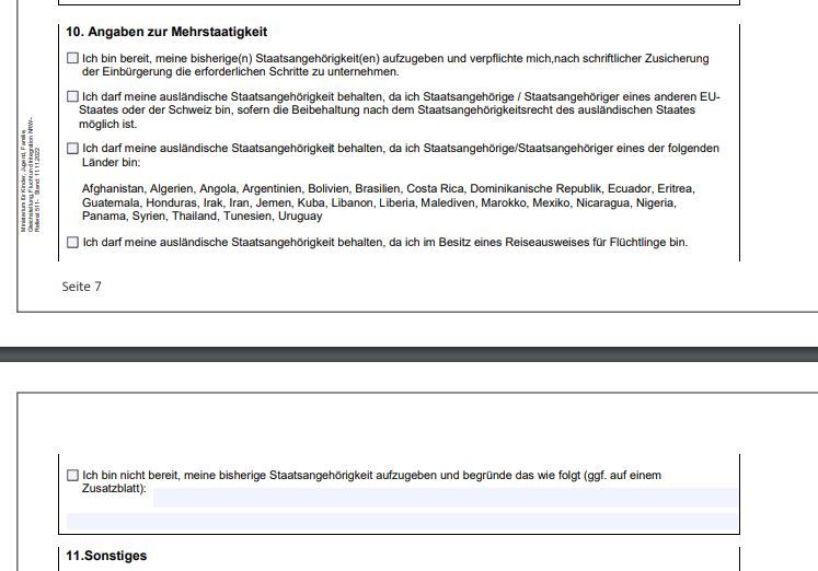 "Ich bin nicht bereit, meine bisherige Staatsangehörigkeit aufzugeben und begründe das wie folgt (ggf. auf einem Zusatzblatt)":