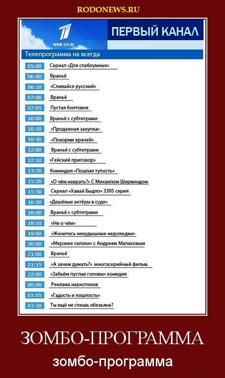 боюсь даже предположить, что Вы лично смотрите по ТВ. Поверьте, то что я смотрю, меня не зомбирует. Меня, вообще, ничего не зомбирует, т.к. для защиты от зомбирования у меня есть головной мозг, а в нём накопленная годами информация о способах поведения, культуре, науке и прочем. Я - не попугай Кеше, сидящий у телека и повторяющий услышанное.