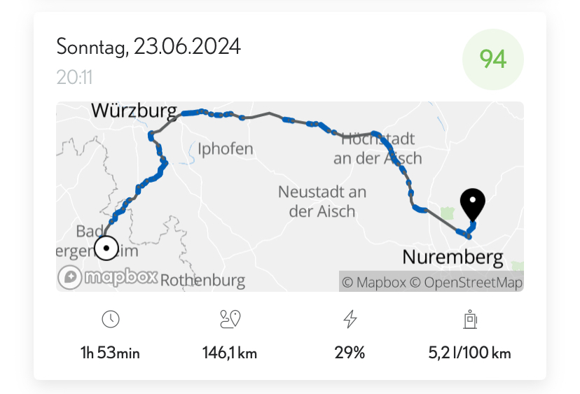 Гибрид на автобане работает великолепно. Эл мотор постоянно помогает Отто. В результате экономия топлива. Вот конкретный пример на фото. На автобане А3 штреке 110 км ( без штау вчера но бауштелле были там скорость была не ниже 80-100.) время работы без Отто мотора 29% от всего времени в пути. Да есть еще бундесштрассе где то 40км. Жирные синие