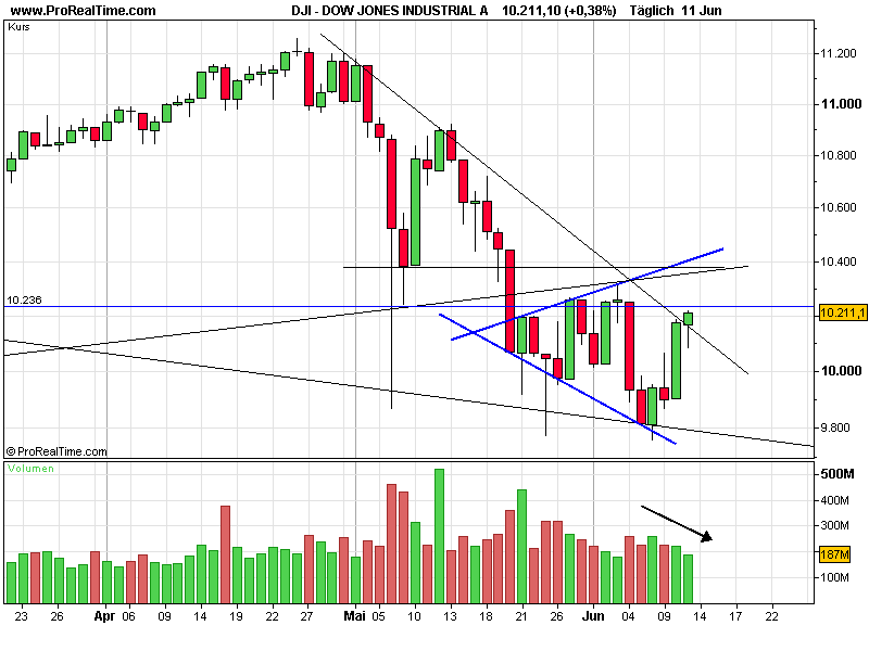 Ich bin seit dem vorletzten Freitag bärisch eingestellt. Zwar werden momentan Abwärtskanäle nach oben gebrochen, eine wichtige Voraussetzung wird aber dabei nicht erfüllt: das Handelsvolumen ist relativ klein.