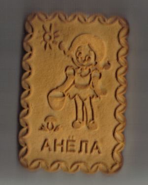 На печенье - вареное сгущенное молоко с орехами и изюмом. Глазировано темным шоколадом, декорировано "золотым песком".