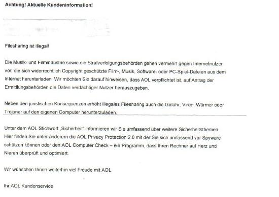 а в ответ можно написать что АОЛ не имеет права сохранять ИП информацию о флат-кундах и в случае сохранения и передачи этой информации можно подать иск против АОЛ