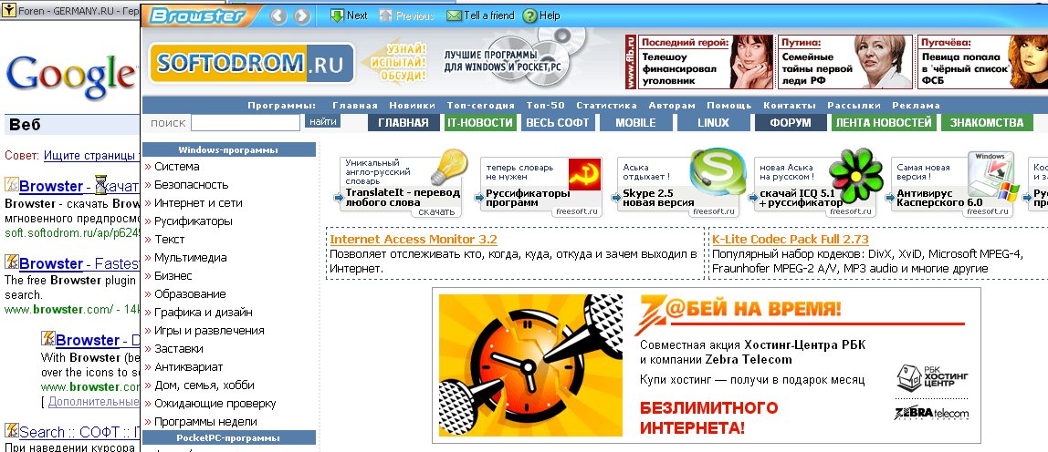 Очень удобно при поиске в Google, вам ненадо заходить на сайт, можете через Browster заглянуть.