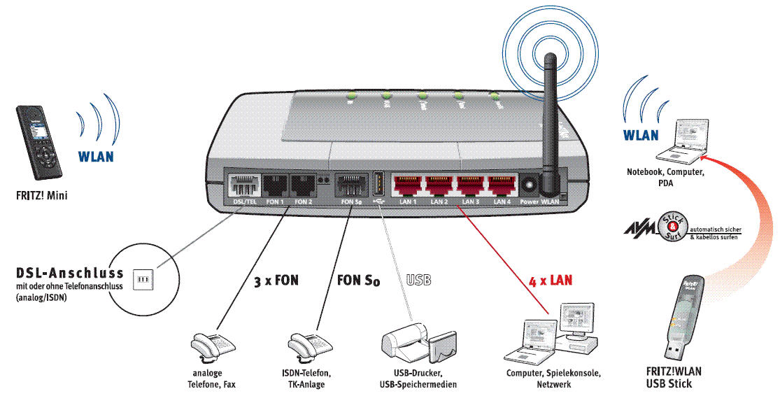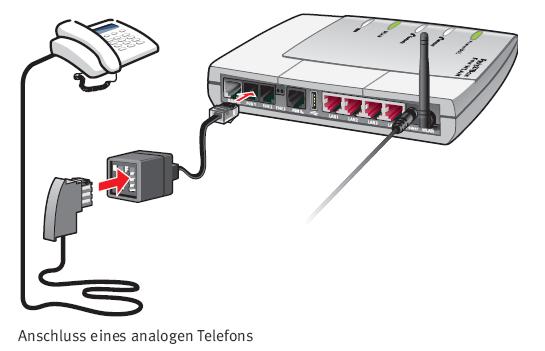 1. В боксе одна дырка RJ11 для аналоговых телефонов, в которую вставляется тройник с тремя TAE куда уже любой немецкий телефон идет. Тройник входит в комплект. (Так что на картинке должен быть показан только один разъем для аналоговых телефонов.)