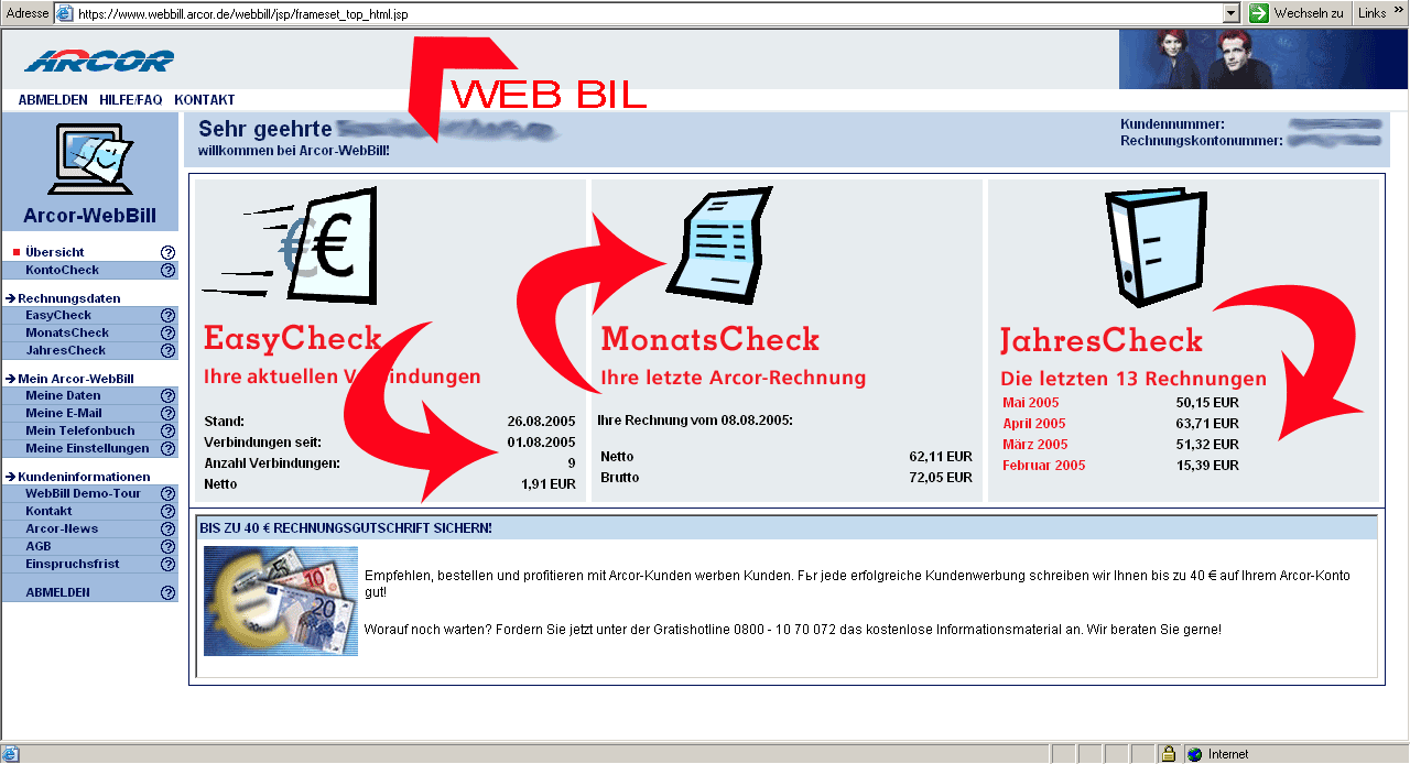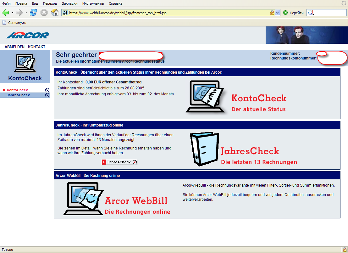 Народ кто пользуется Arcor подскажите как пробратся к своему Abrechnung хочу посмотреть сколько накачал гигов, сколько по телефону наговорил.