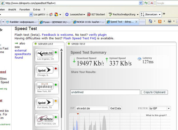 попробуйте замерить тут вашу скорость http://www.speedreport.de/dsl-geschwindigkeit/ выбираю сперва в левой строке DSL Speedtest,а потом не выбирая анбитера ниже по середине нажимаю на Speedtest starten