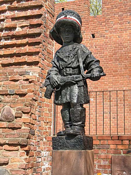 Один из самых пронзительных варшавских памятников - "Маленький повстанец", бронзовый мальчишка лет пяти на вид с трофейным "шмайссером" наперевес и в огромной немецкой каске; горожане повязывают каску бело-красной лентой.