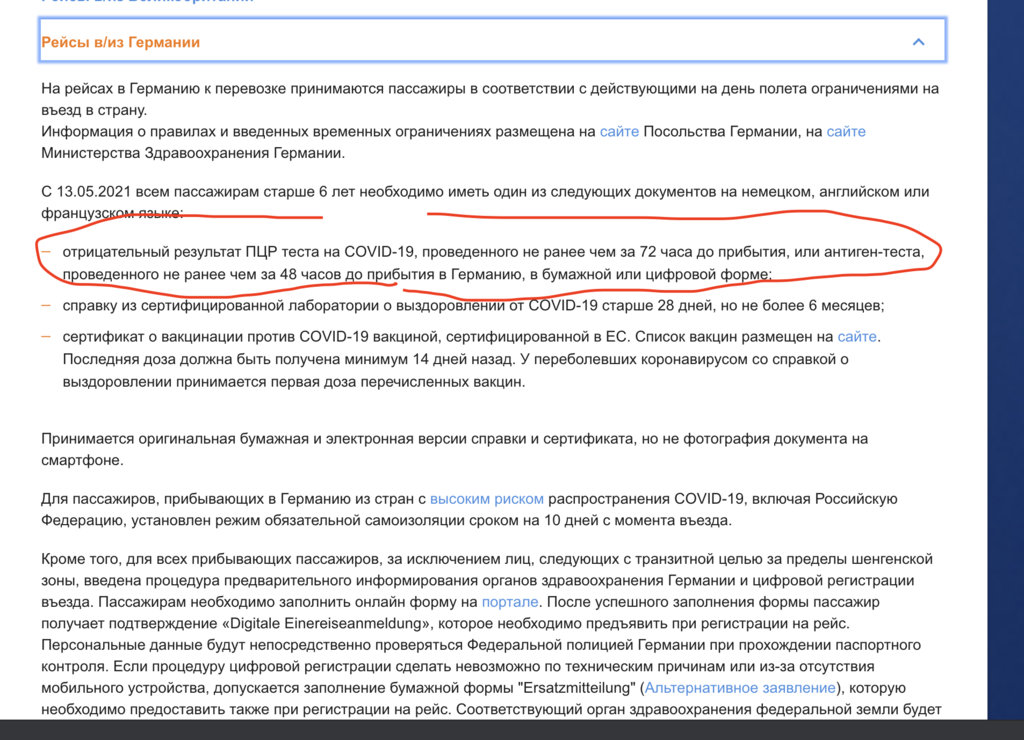 Информация о правилах и введенных временных ограничениях размещена на сайте Посольства Германии, на сайте Министерства Здравоохранения Германии.С 13.05.2021 всем пассажирам старше 6 лет необходимо иметь один из следующих документов на немецком, английском или французском языке:отрицательный результат ПЦР теста на COVID-19, проведенного не ранее чем за 72 часа до прибытия, или антиген-теста, проведенного не ранее чем за 48 часов до прибытия в Германию, в бумажной или цифровой форме;справку из сертифицированной лаборатории о выздоровлении от COVID-19 старше 28 дней, но не более 6 месяцев;сертификат о вакцинации против COVID-19 вакциной, сертифицированной в ЕС. Список вакцин размещен на сайте.