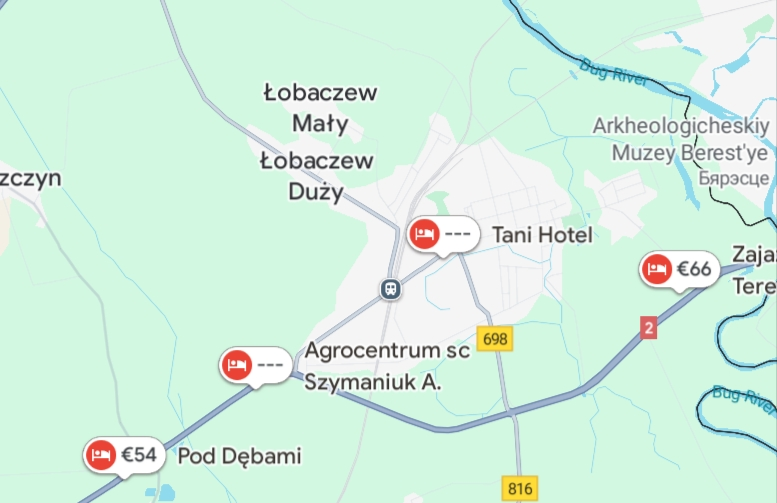там все гостиницы стоят вдоль трассы. Там же нет туристов, как таковых, все едут к /от границы. Поэтому там в основном такие гостевые дома, все вместе - гостиница и ресторан и магазин может быть.
