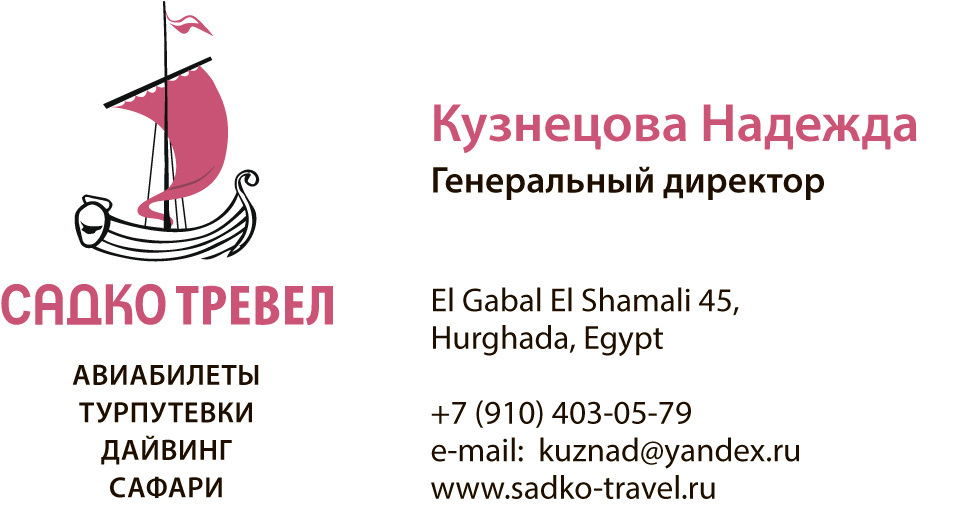 Наша компания занимается дайвингом. морскими прогулками, круизами по Красному морю и т.д. В том числе и туризмом. Более подробно на нашем сайте www.sadko.de . Контакты нашего туристического агенства во вложении. Всё делается он-лайн, не выходя из дома. Документы получаете на е-мейл. Весь персонал разговаривает на русском языке, как на родном. :)