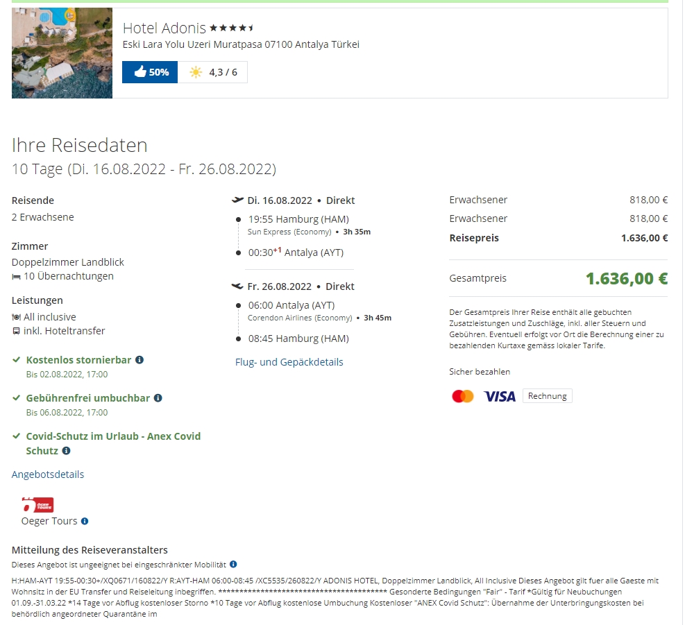 Предложите на август Анталья отель 3 звезды на 10 дней на двоих с перелётом и трансфер всё включено. Я послушаю.