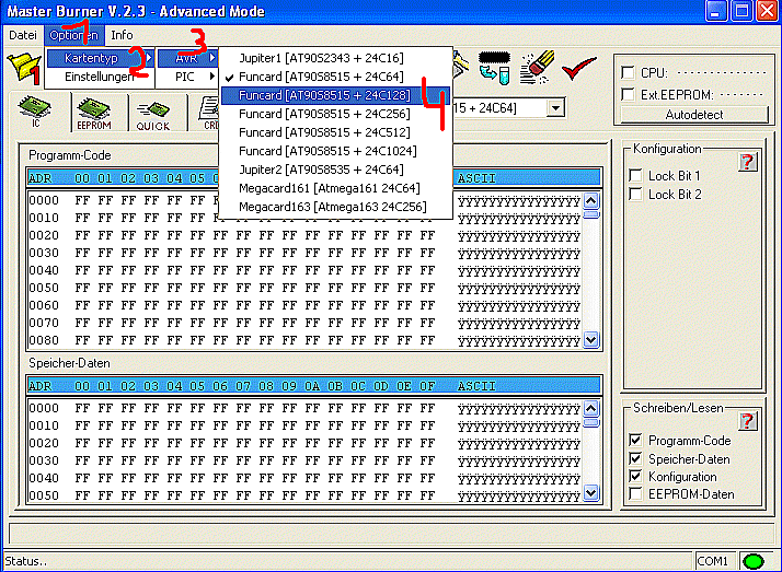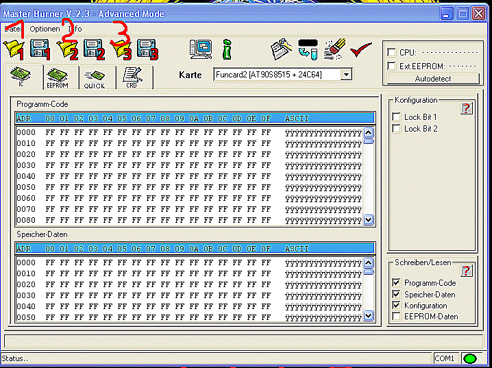 Фан.1.Flash.2.int.Eeprom. 3.ext.Eeprom. Модус на програматоре сам себя определяет. Вообще то к Geist2005 это было адресованно, извиняюсь, что вмешался.