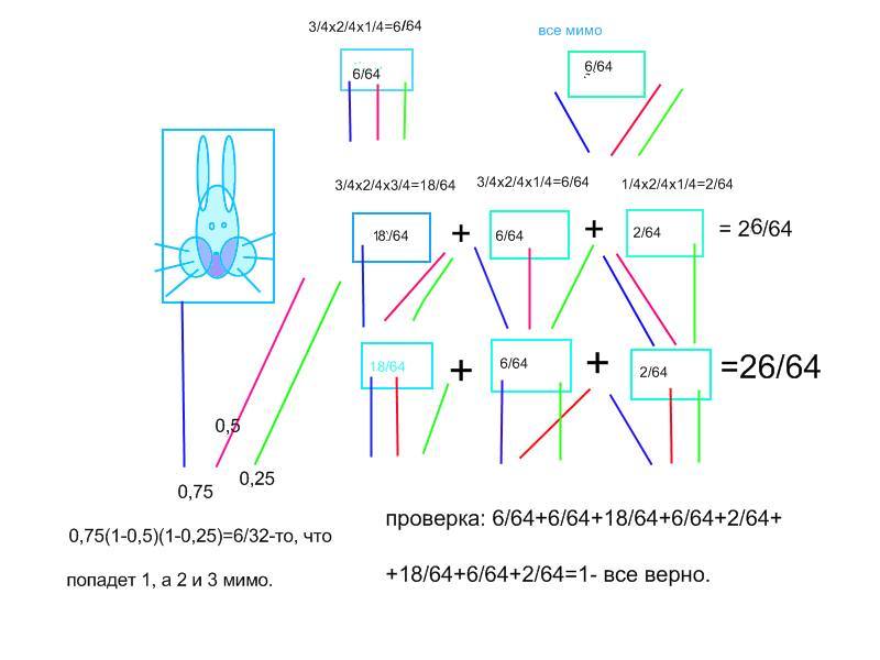 заодно проверьте ваши подсчеты, когда вы складываете все возможные взаимоисключающие события, что по определению должно равняться единице и ясно без всяких подсчетов, но вы упорно вычисляете и получаете какую-то другую циферь, да ещё умудряетесъ затем что-то сложить наобум, чтоб подогнать под эту циферь ответ "проверочного" способа.