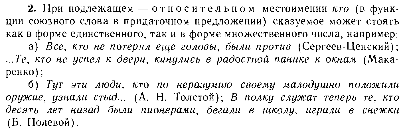 При этом, когда речь идет о многих, нормой является употребление сказуемого - глагола, прилагательного или причастия в форме ед. ч. Форма мн. ч. здесь возможна в не строго нормированной речи: кто едет! (едут), должны прийти к восьми утра; все, кто внесен в список/(внесены в список), приняты. В том случае, когда сказуемое выражено прилагательным, причастием или глаголом в форме прош. вр. или сослагат. накл., нормально употребление этих слов при местоимении кто в форме муж. р., а при местоимении что v в форме сред. р.: кто это видел, тот не забудет; что сделано, то сделано.