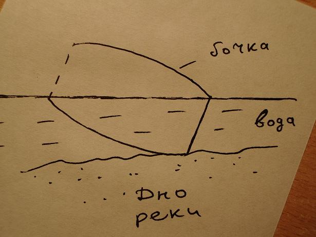 Единственное решение, которое мне представляется возможным, это положить бочку в реку так, как это показано на рисунке. После после этого нужно поднять бочку. Таким образом, воды в бочке будет ровно половина и ведро тут не при чем.
