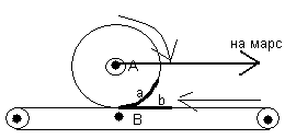 для движения А относительно В необходимо, чтобы путь проходимый колесом (маленькая а) был больше пути, проходимым транспортером (маленькая b) это возможно лишь в том случае, если скорость колеса была больше скорости транспортера