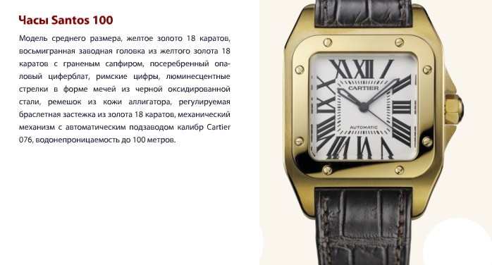Стереотип сломал друг Луи, бразильский шальной аристократ Альберто Сантос-Дюмон, один из пионеров авиации. Шарить по карманам в поисках часов во время полетов было несподручно, и он попросил молодого Картье создать что-нибудь этакое специально для него. Так в 1904 году появились на свет первые часы Сантос. Поскольку в то время не было ничего более модного, чем авиация, модель Сантос вызвала невероятный интерес. Спрос родил предложение. В 1911 году модель появилась в продаже, завоевала бешеную популярность и не теряет ее до сих пор.